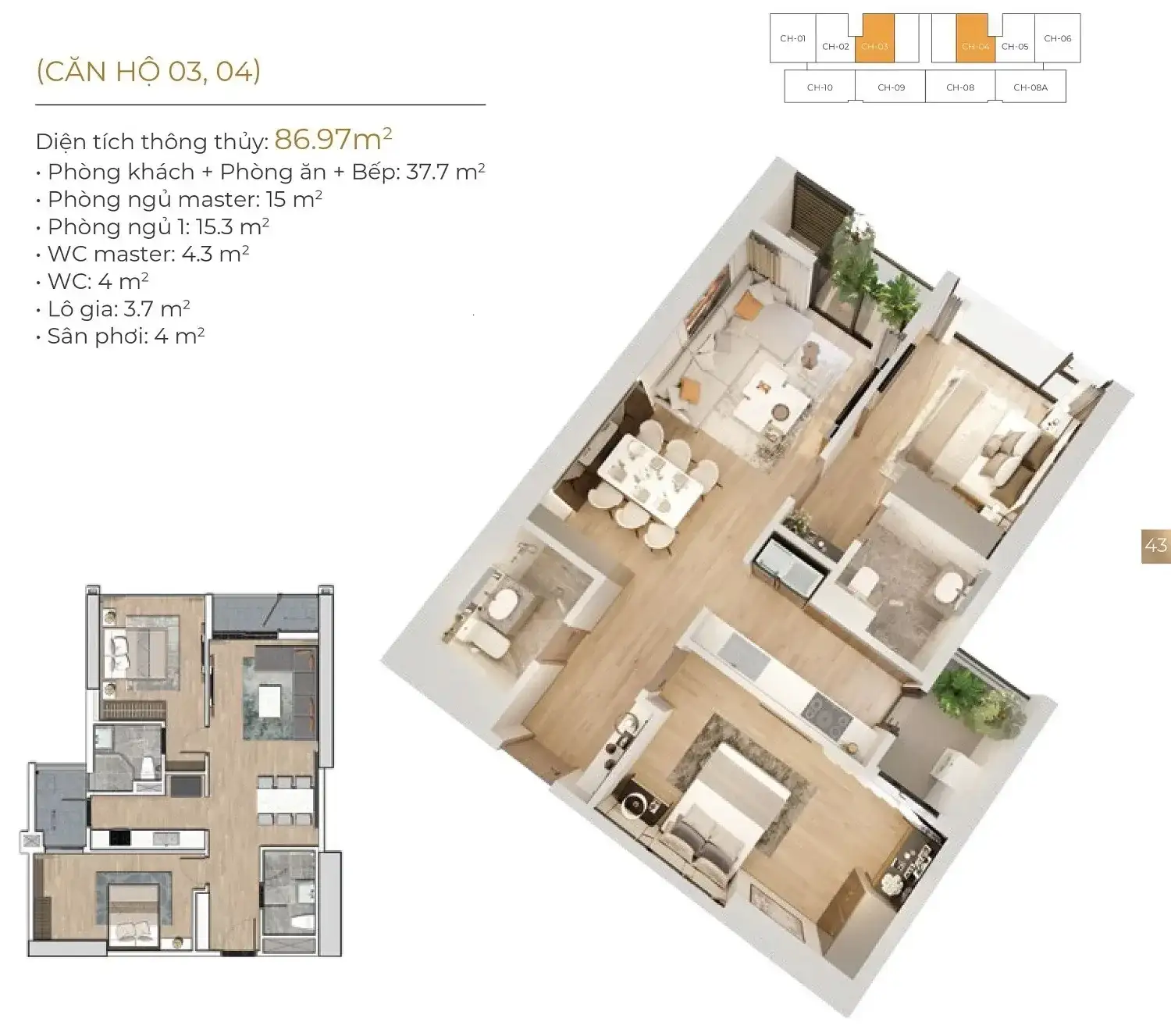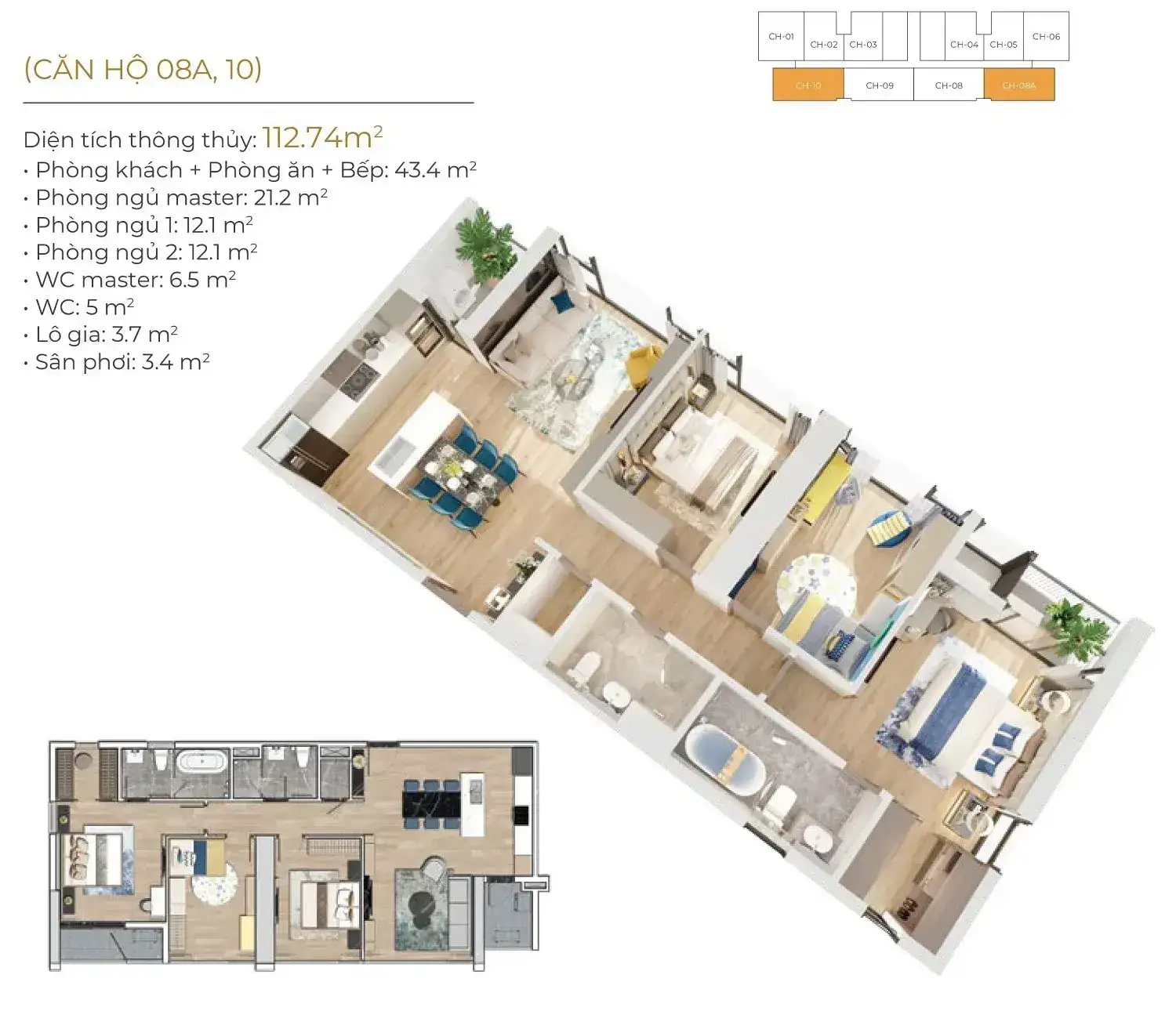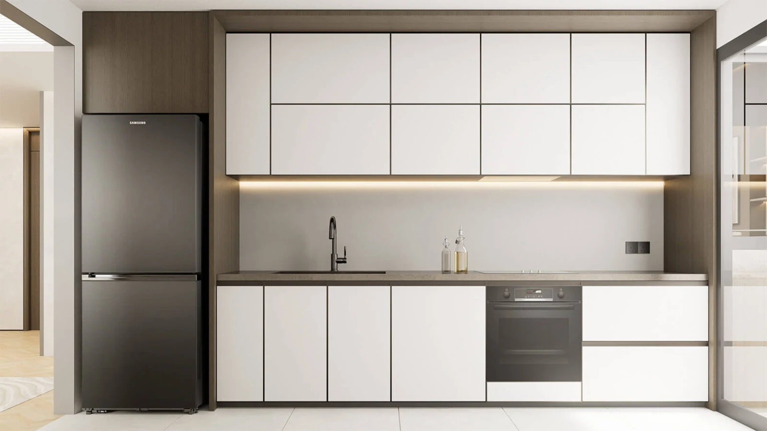 - Khu vực Bếp: KHÔNG bao gồm tủ bếp, bếp từ hay máy hút mùi. CĐT chỉ để sẵn đường điện công suất lớn, đường cấp/thoát nước và ống thoát khí ngầm.