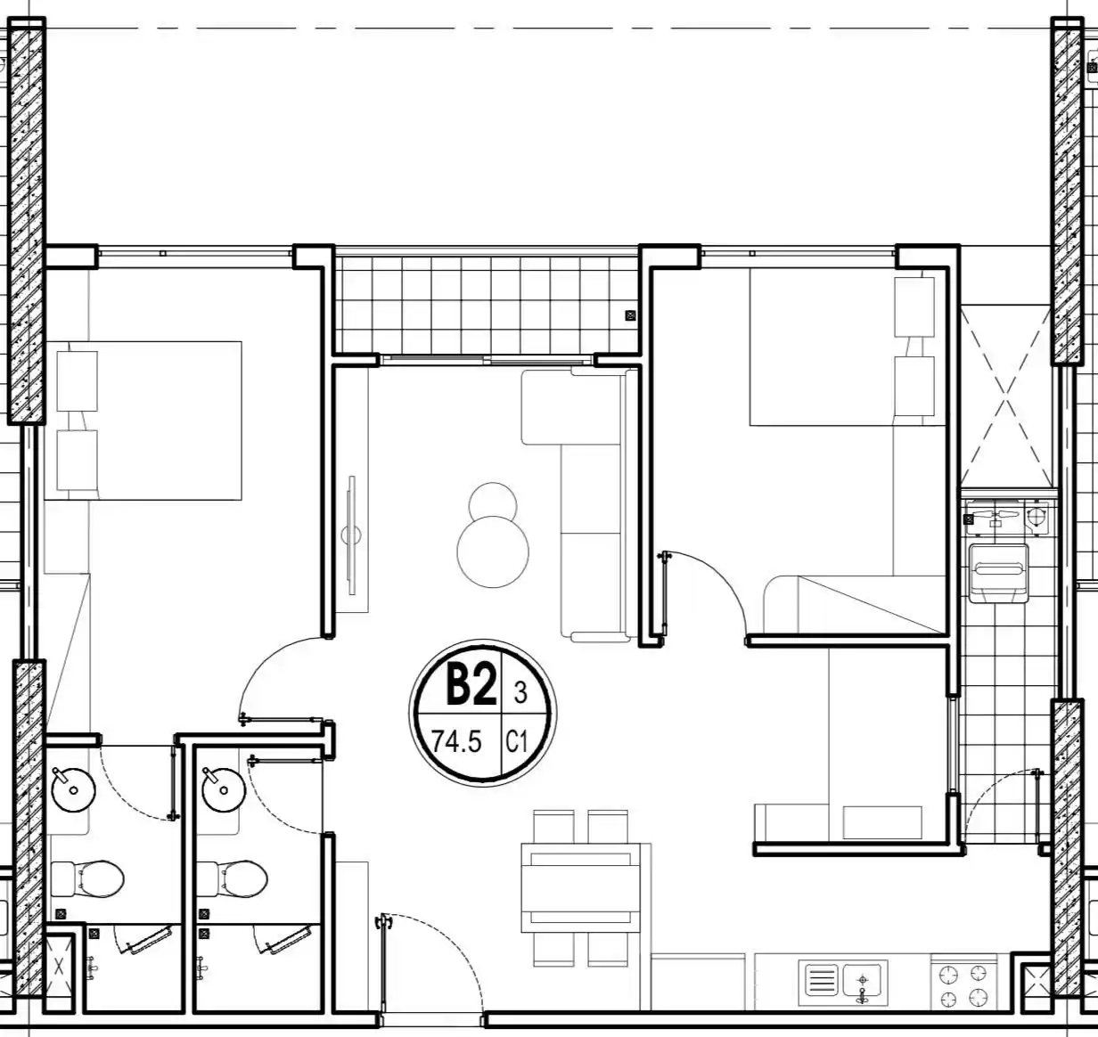 Mặt bằng căn 2PN “hoa hậu” 74.5m² – Lựa chọn hoàn hảo cho gia đình trẻ muốn không gian sinh hoạt chung rộng rãi như căn 3PN.