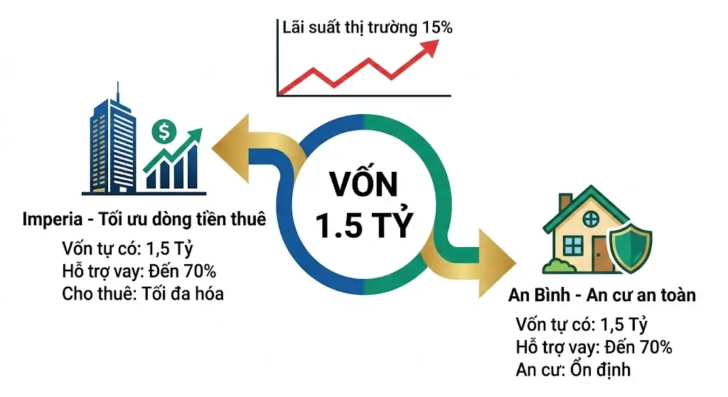 ⚠️ Thực tế tín dụng 2026: Lãi suất 15% và động thái siết cho vay Hiện nay, mức lãi suất thả nổi đã chạm ngưỡng 15%/năm, các ngân hàng đang siết chặt room tín dụng. Người “vốn mỏng” gần như “bít cửa” mua nhà. Tuy nhiên, nếu anh chị cầm sẵn 1.5 tỷ tiền mặt, anh chị nghiễm nhiên trở thành khách VIP, hồ sơ được ngân hàng duyệt “thần tốc”. Vấn đề cốt lõi là: Sử dụng 1.5 tỷ này làm vốn đối ứng (Equity) vào dự án nào để tối ưu nhất?