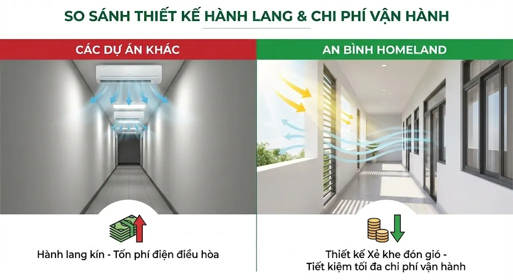 Bí quyết nằm ở thiết kế hành lang “xẻ khe” đón gió và ánh sáng tự nhiên. Tòa nhà không bị bịt kín bằng vách kính, giúp Ban quản lý giảm thiểu tối đa tiền điện cho hệ thống điều hòa và chiếu sáng hành lang (khoản ngốn tiền nhất trong vận hành chung cư). Đây là lợi thế “kép”: Cư dân vừa có hành lang thoáng khí tươi, vừa tiết kiệm được túi tiền hàng tháng!